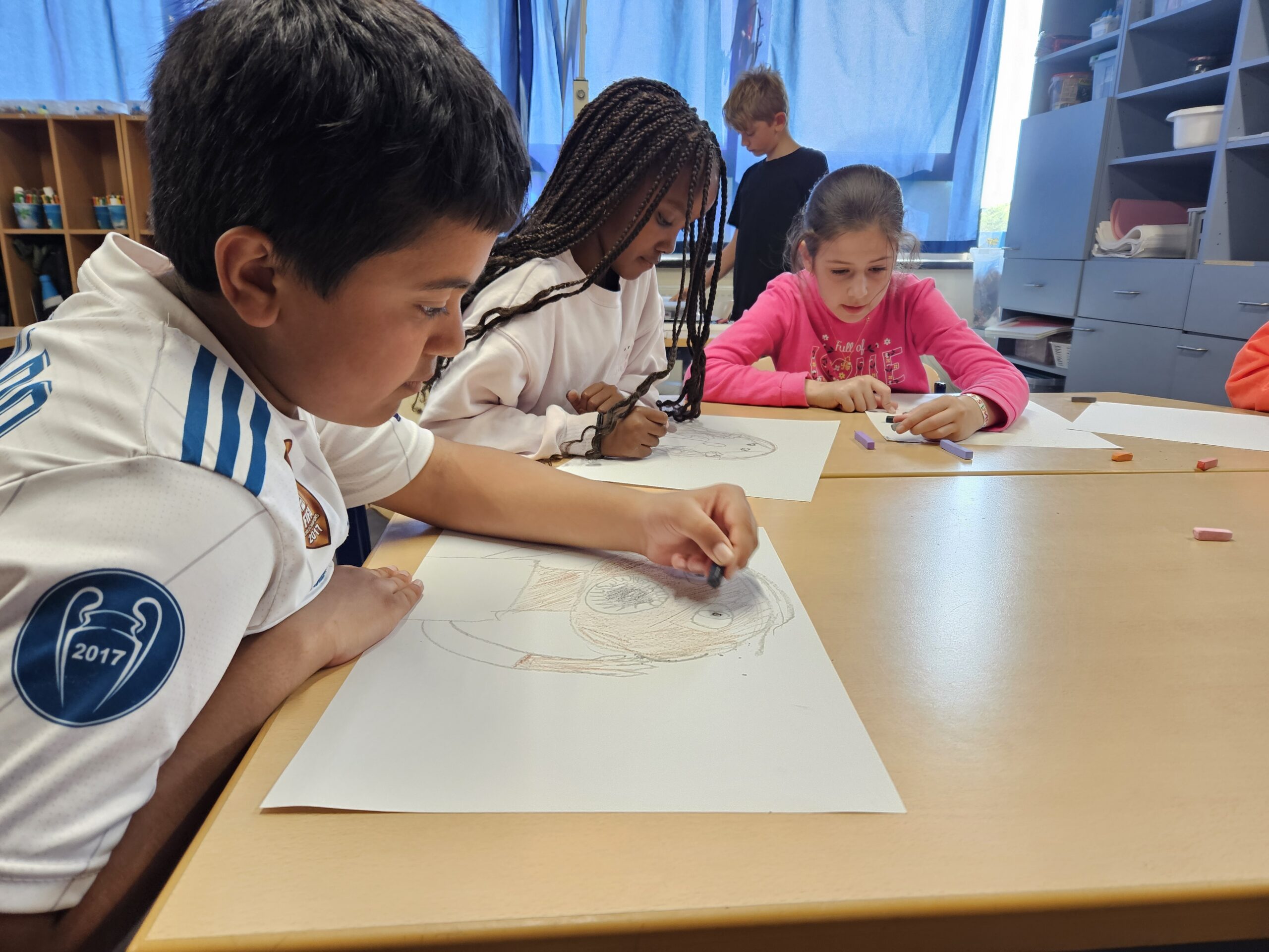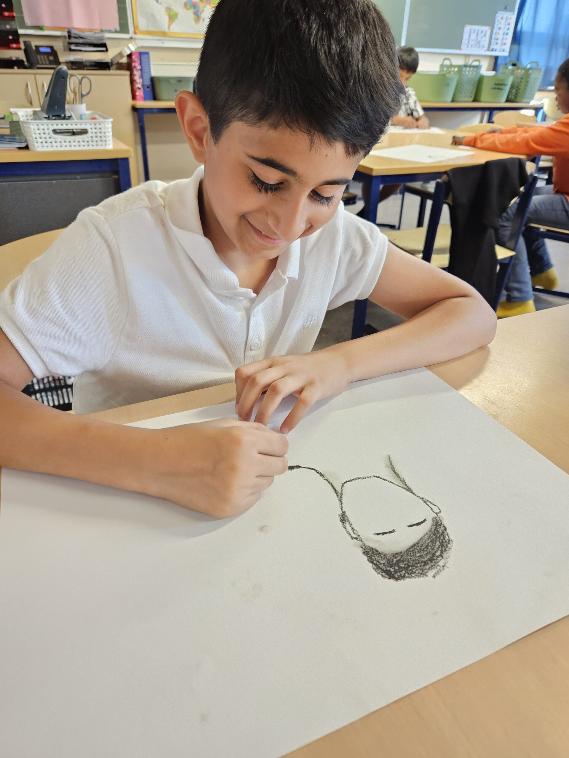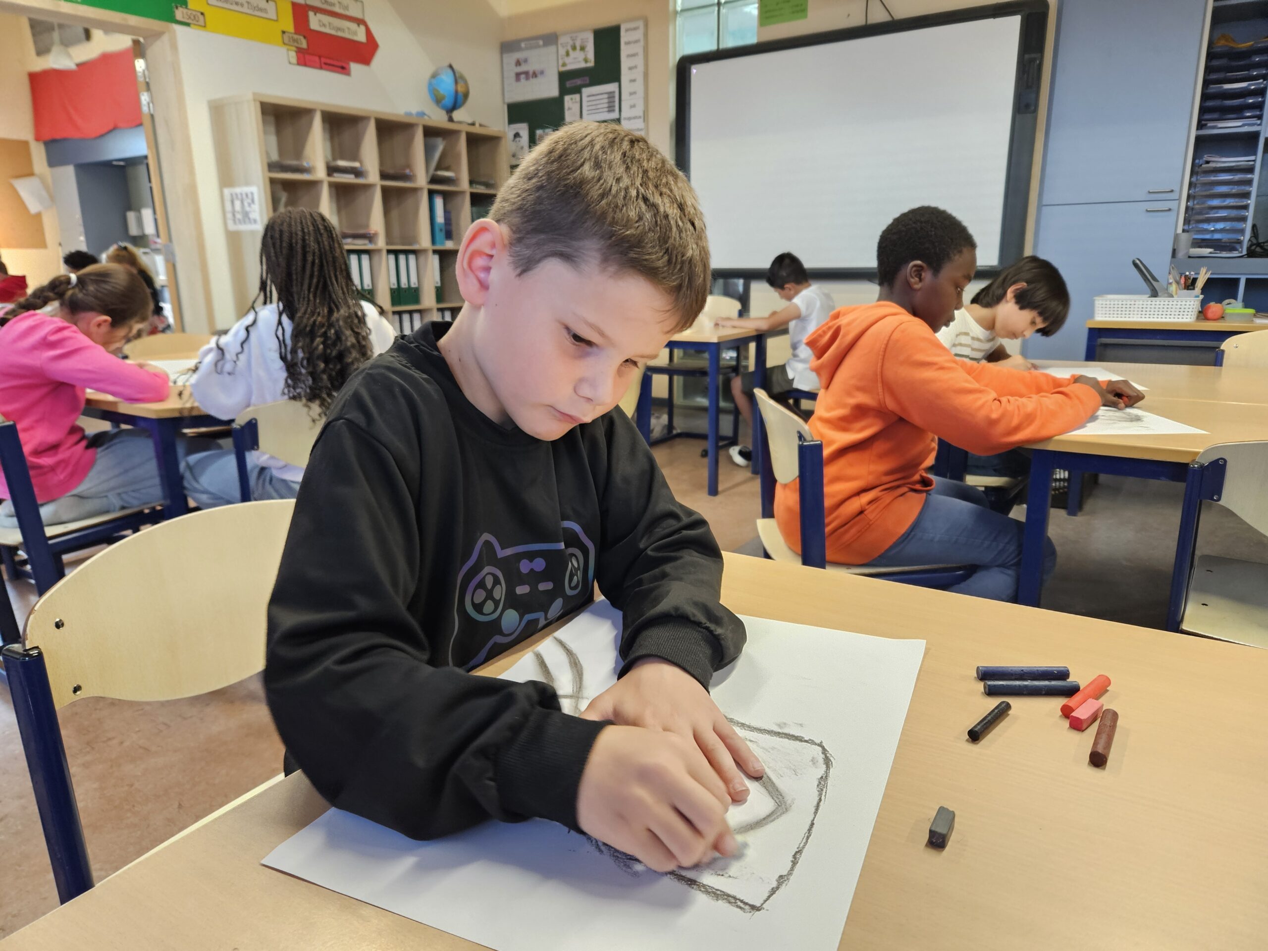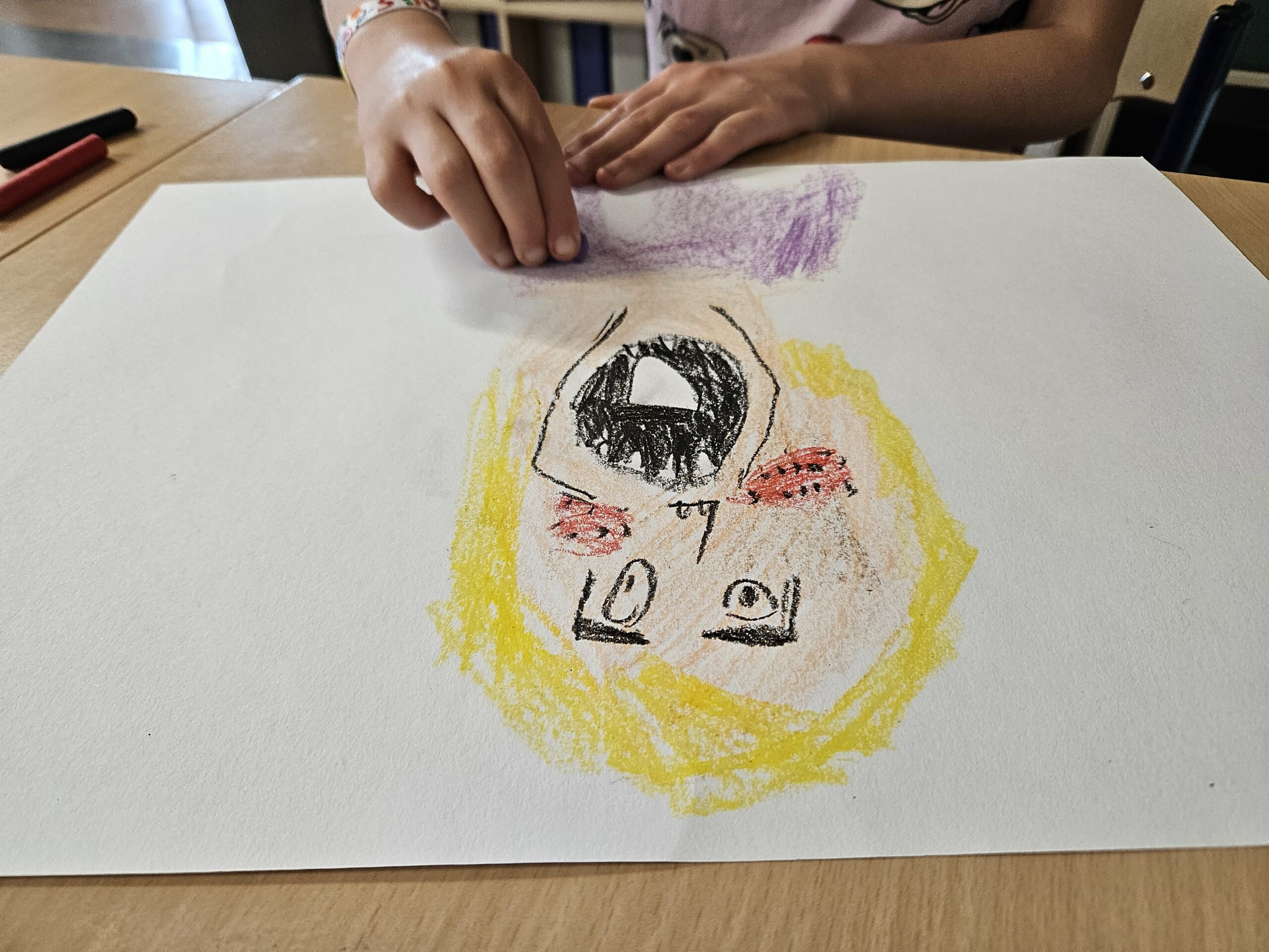 Tussen de lessen van Nederlands en wiskunde door gingen we de voorbije dagen ook creatief aan de slag. Vorige week observeerden we schreeuwende mensen. We letten daarbij op hun mimiek. We gingen zelf aan de slag met wasco’s en pastelkrijtjes en maakten zo ons hedendaags zelfportret geïnspireerd door het bekende werk van Edward Munch. Deze week leerden we het begrip “découpage” en zagen we heel wat werken van de kunstenaar Henri Matisse. Wij probeerden ook een zeebodem met waterplanten en zeedieren te creëren door te knippen en (overlappend) te plakken.